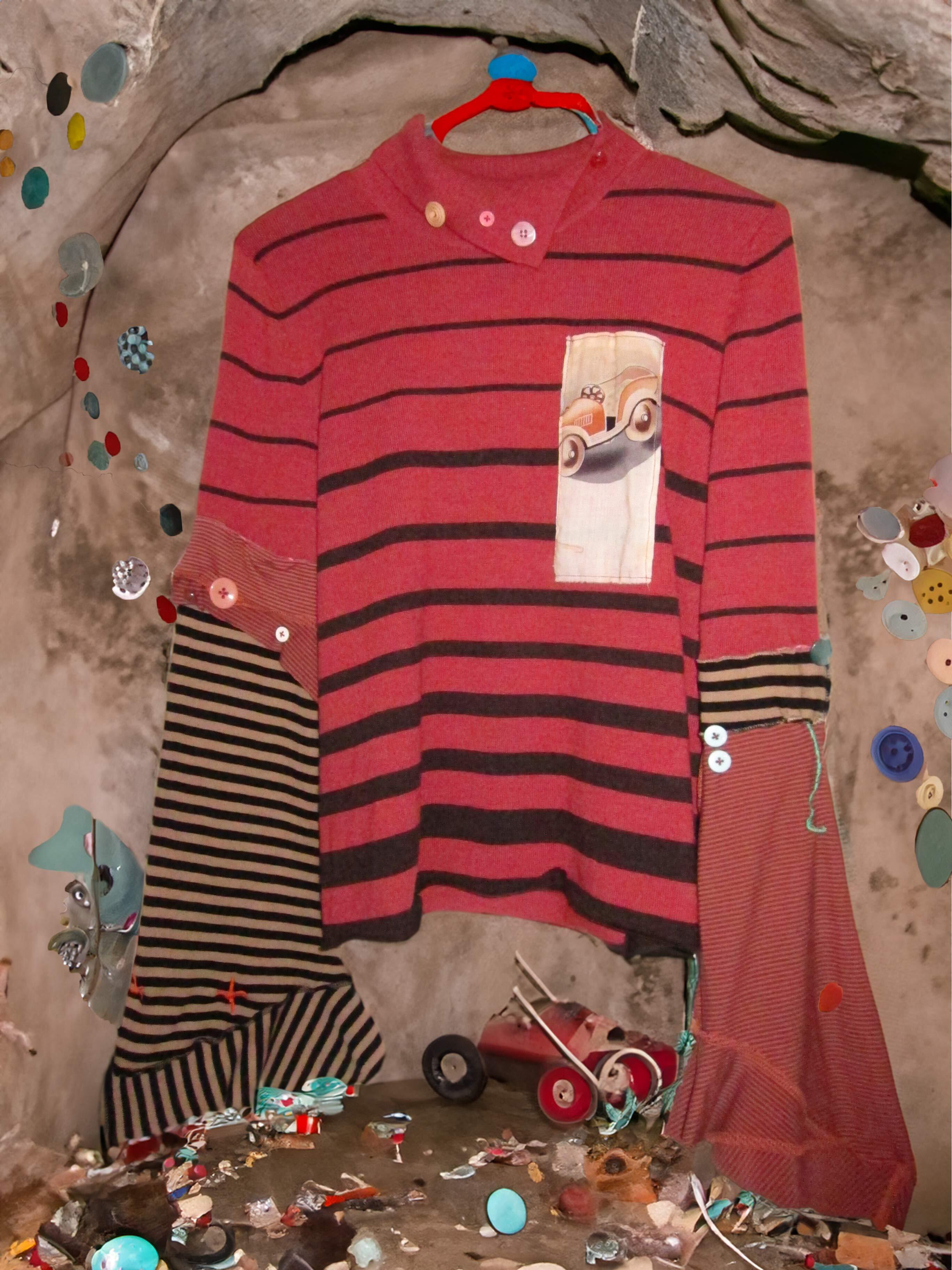 All materials are sourced from secondhand clothing and reclaimed fabrics, each bearing its own imperfections and memory.